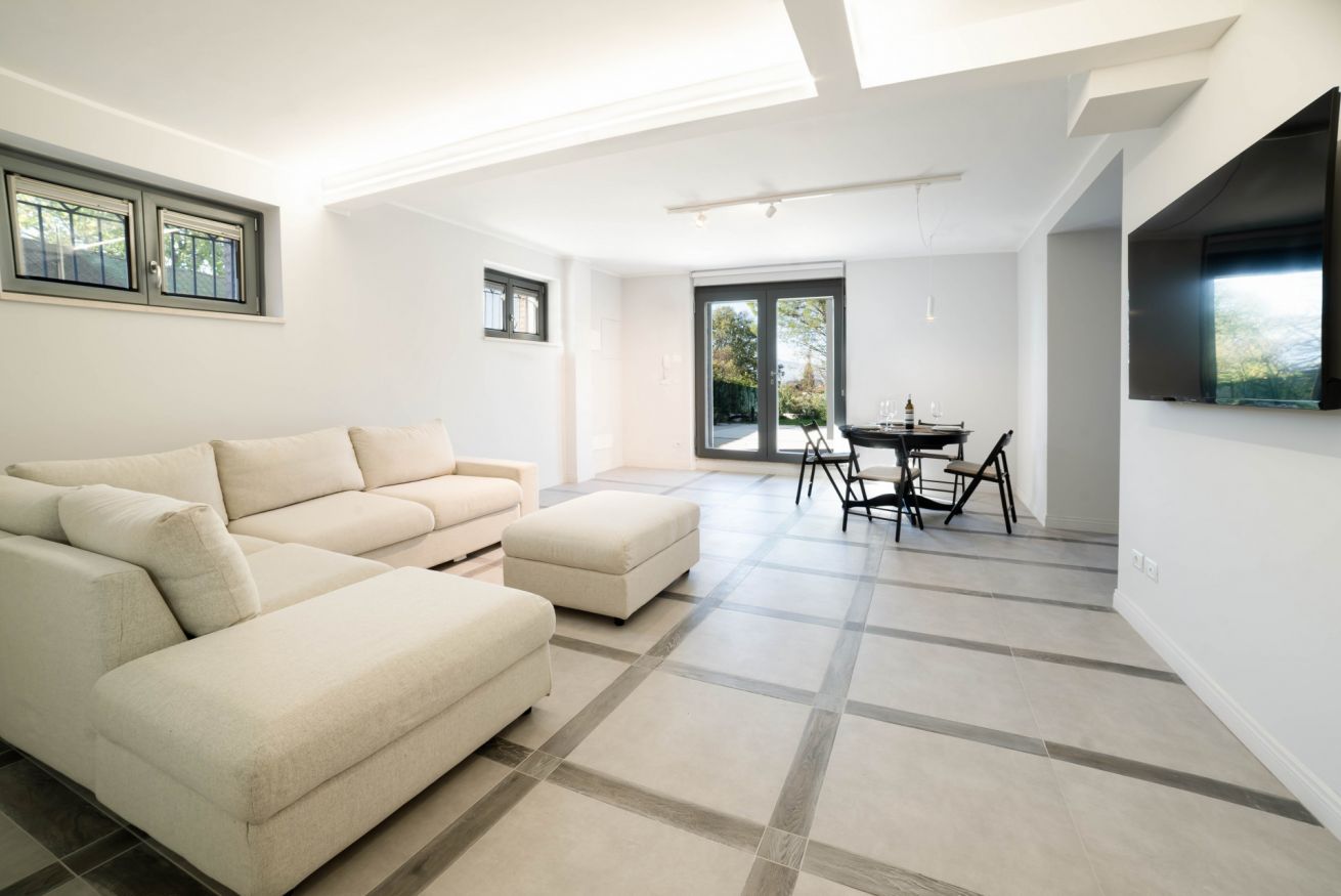 Ampio soggiorno con divano letto matrimoniale, tavolo da pranzo e TV