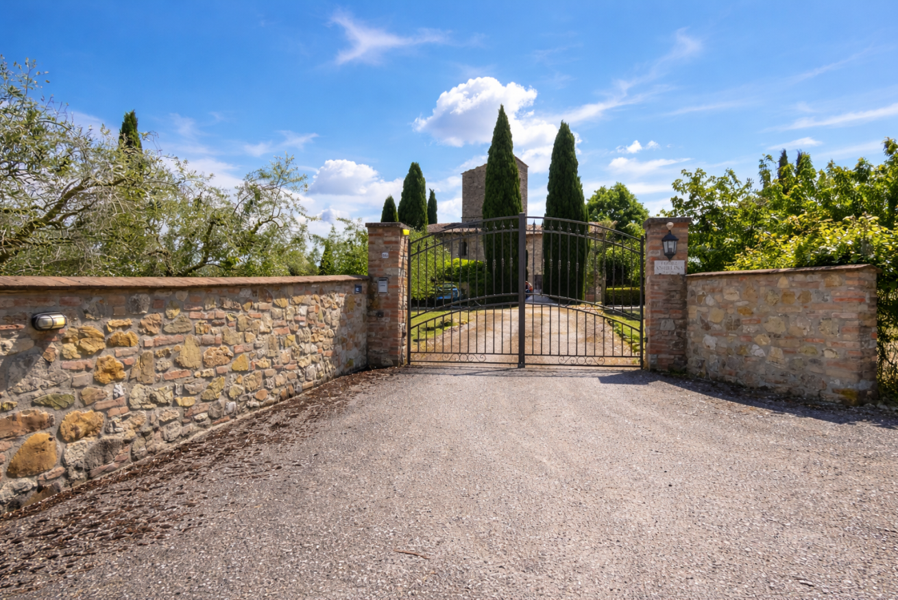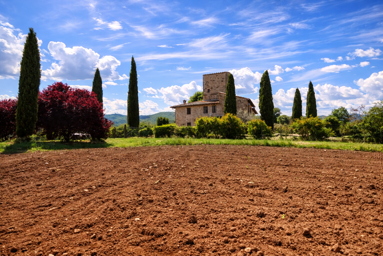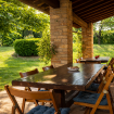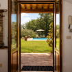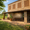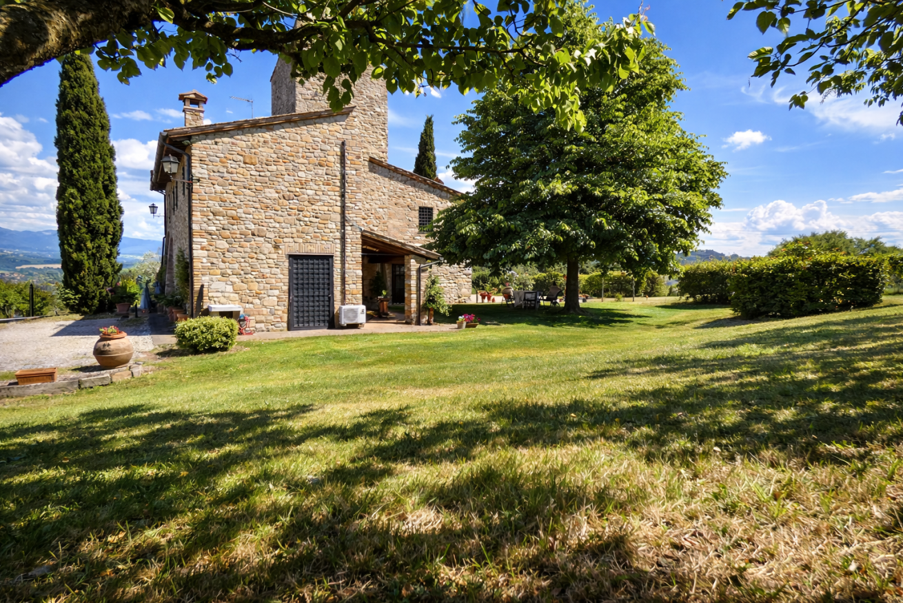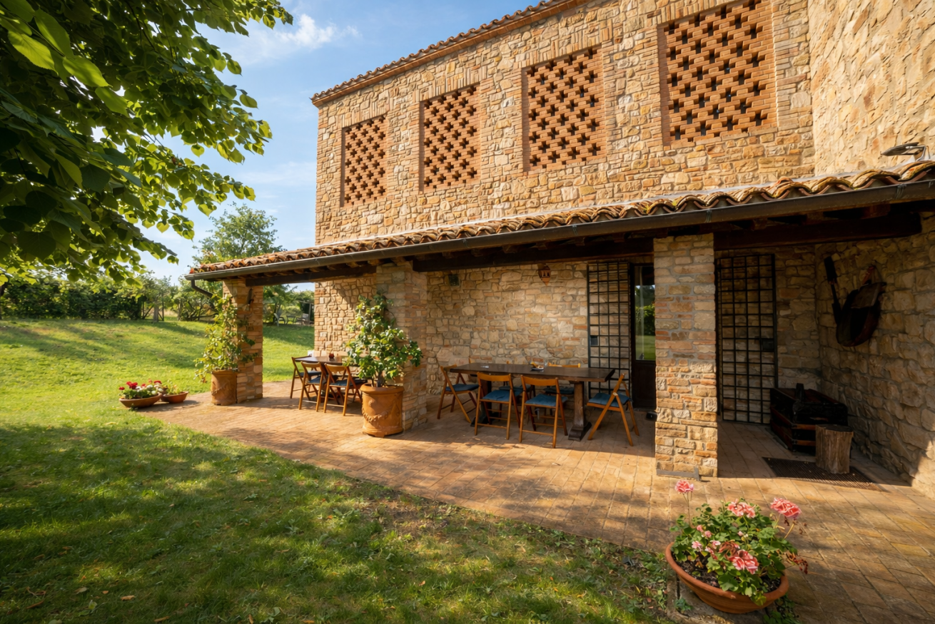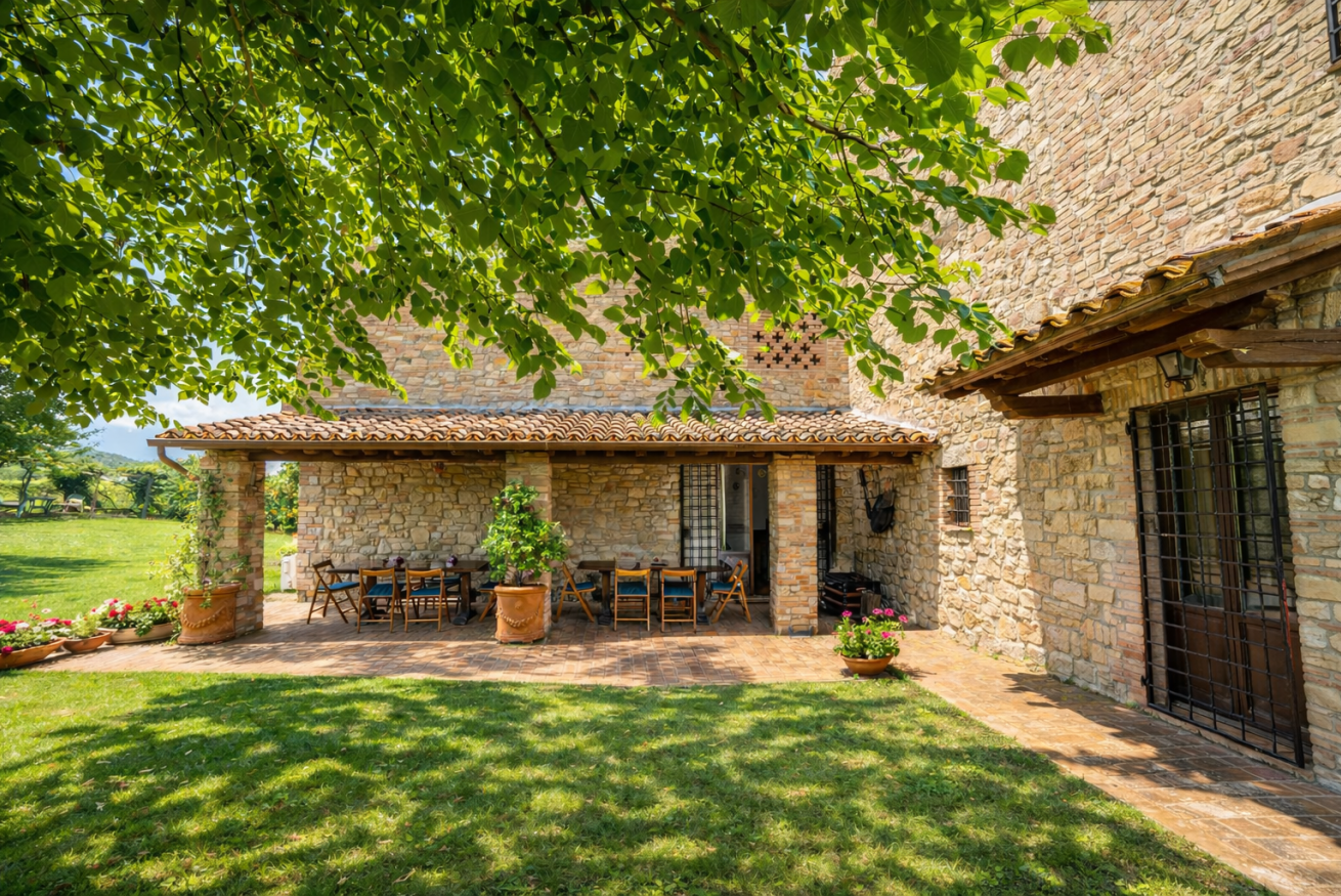 La Casa Vecchia • Piano Terra: Ampio soggiorno con camino in pietra; accogliente biblioteca/studio; sala da pranzo formale; cucina completamente attrezzata che si apre su una terrazza coperta ombreggiata da un maestoso tiglio.