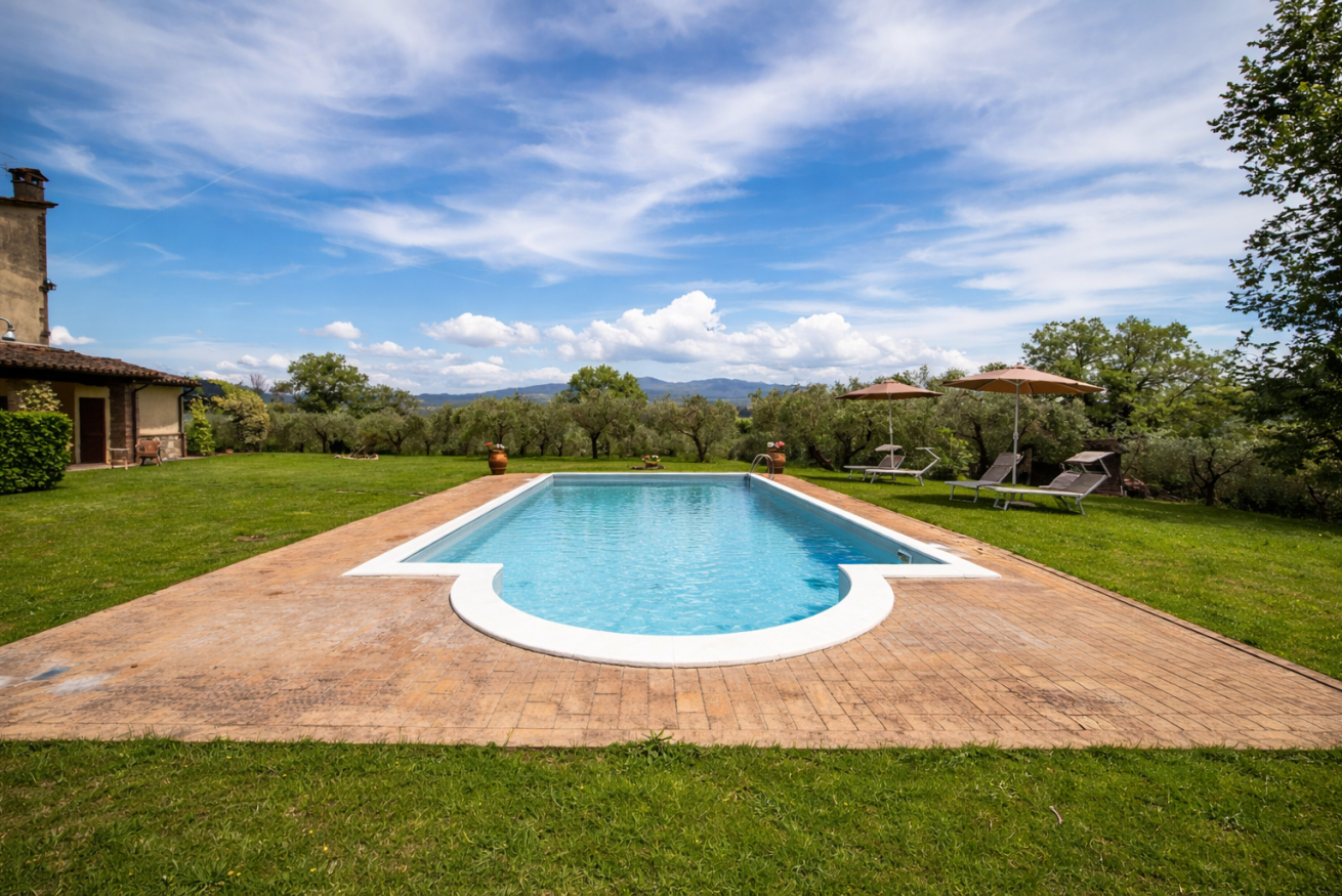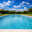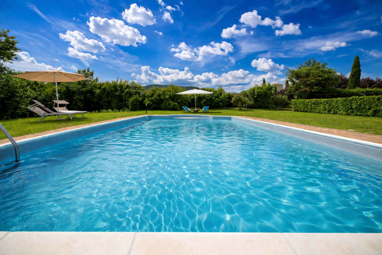 • Piscina: 12 × 6 m, profonda 1,4 m, completamente illuminata per i tuffi serali, recintata in modo sicuro con lettini e ombrelloni.