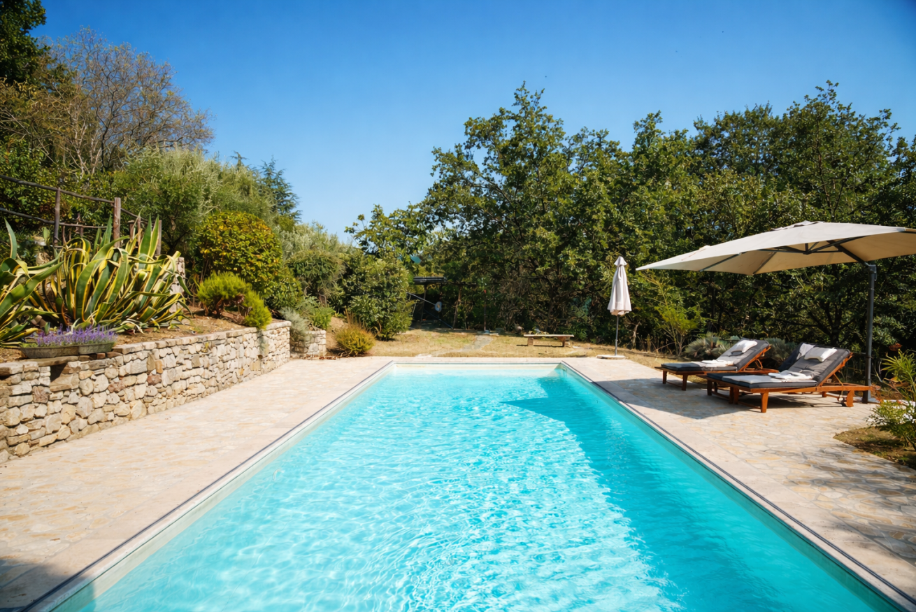 La proprietà gode di una grande piscina privata inserita armoniosamente nel contesto boschivo circostante.