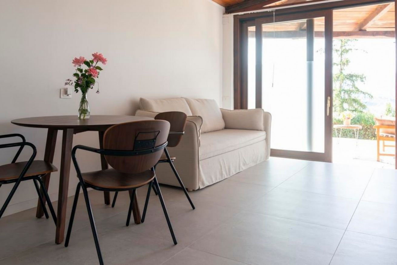Camera 1 (Mini-appartamento): Letto queen-size (160x200), bagno privato en suite con doccia, soggiorno privato con divano letto (160x190), angolo cottura (frigorifero + forno), aria condizionata e TV. La camera ha accesso diretto al giardino.