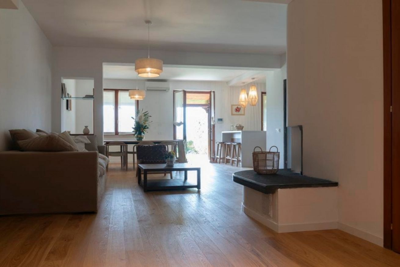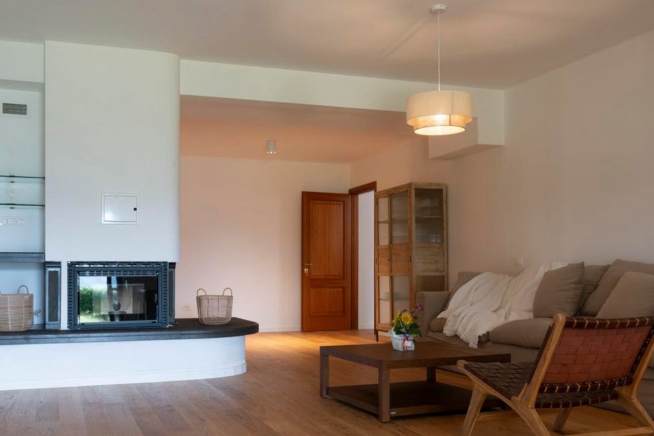 Zone giorno: Un accogliente soggiorno con camino e diverse aree lounge silenziose distribuite in tutta la casa, ideali sia per momenti conviviali sia per ritiri di totale relax.