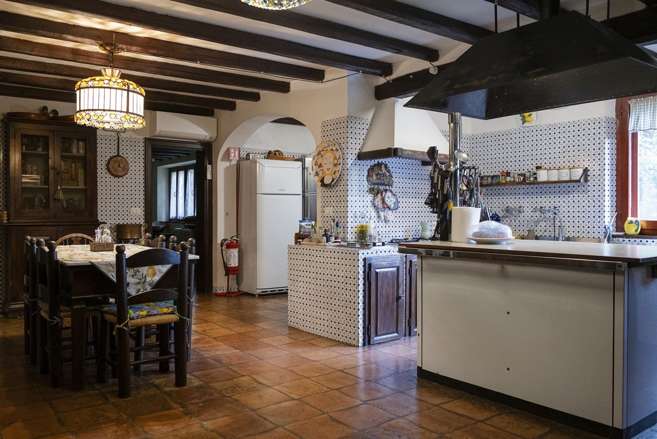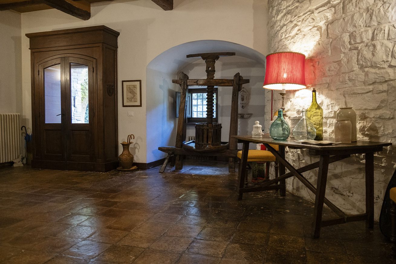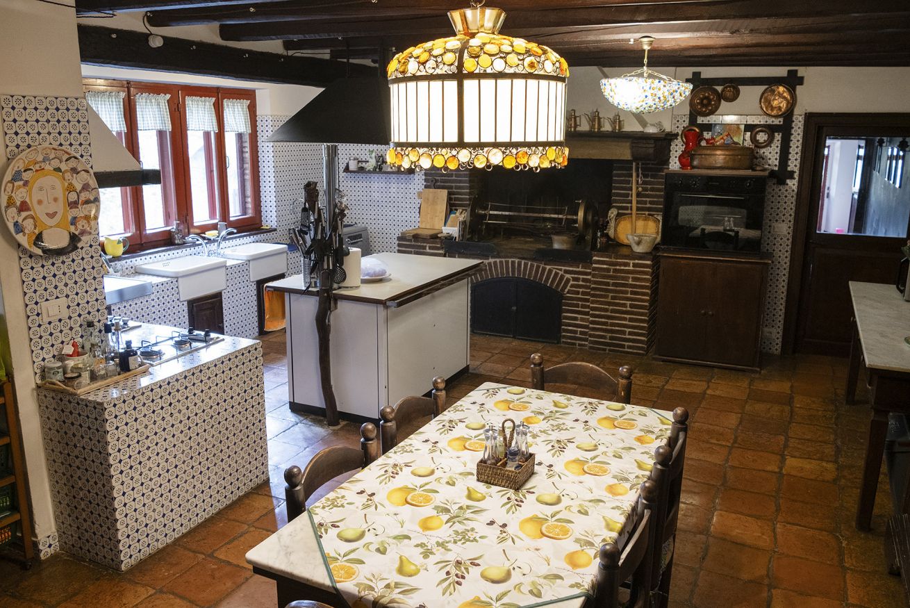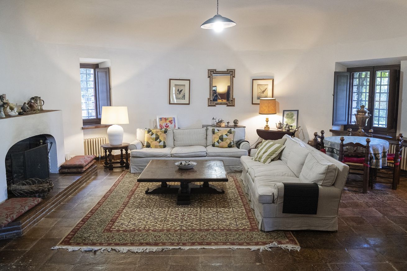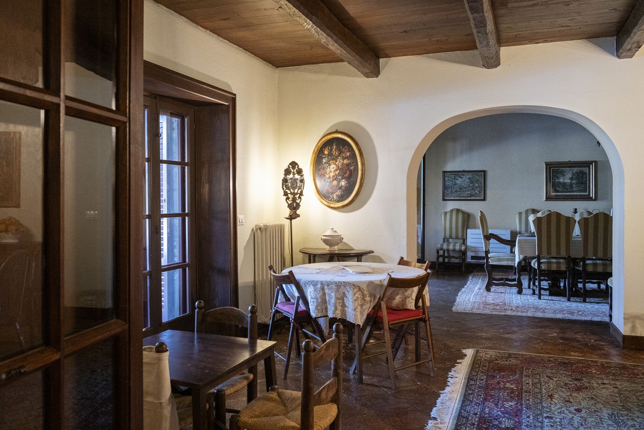 Nel corpo principale storico, al piano terra si sviluppa la luminosa zona giorno, con cucina attrezzata, doppio salone con camino e pianoforte, ideale per momenti di relax e convivialità. Dal salone si accede direttamente al portico, che conduce alla piscina, cuore della vita all’aperto.